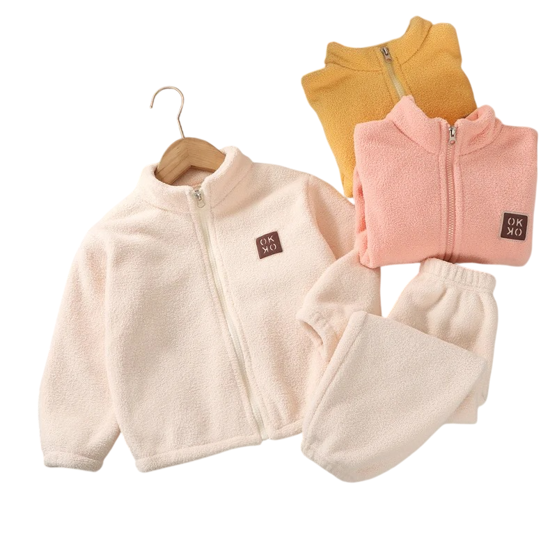Hrejivý unisex detský komplet s plyšovou mikinou na zips a nohavicami poskytuje pohodlie, mäkkosť a teplo pre chladnejšie dni. Celý popis