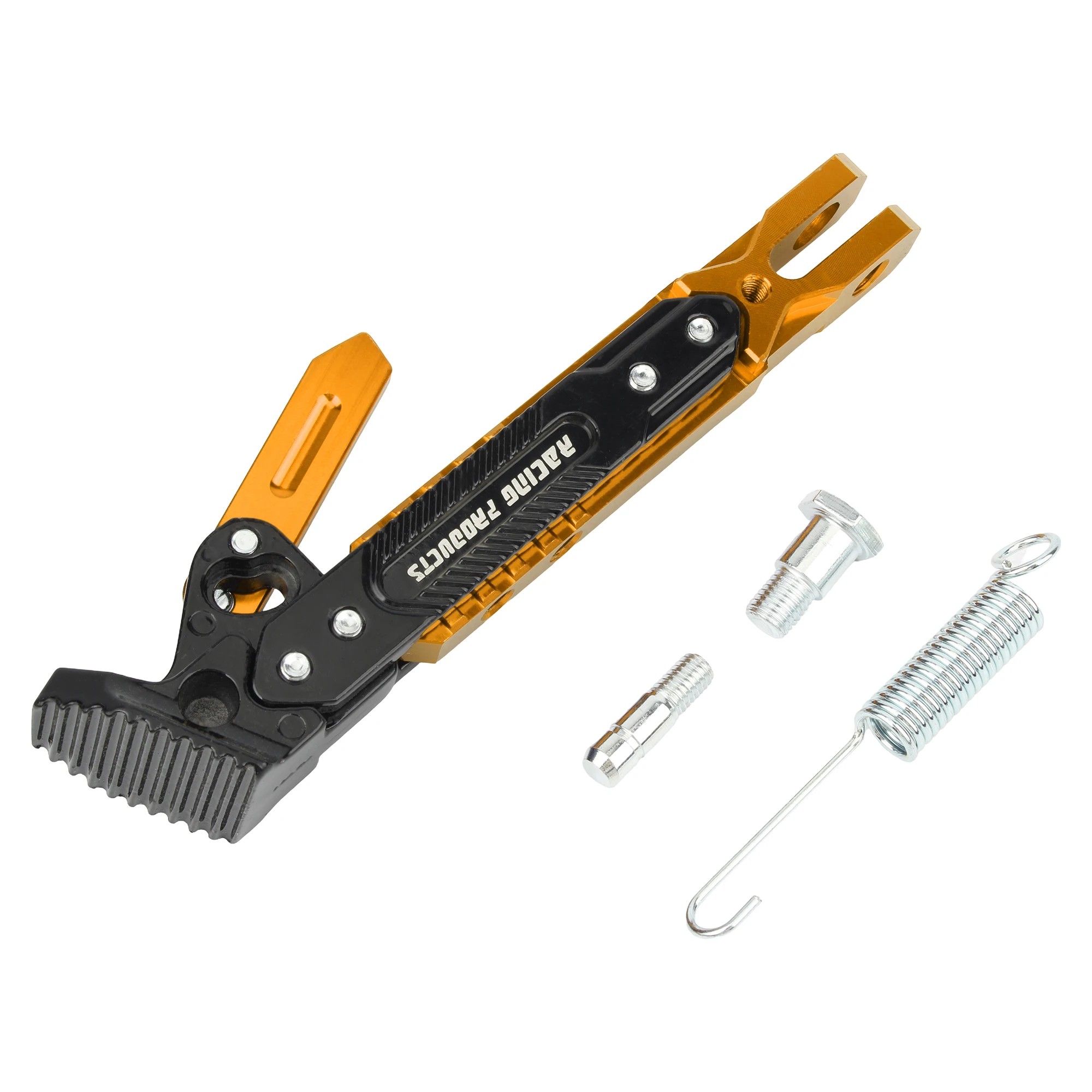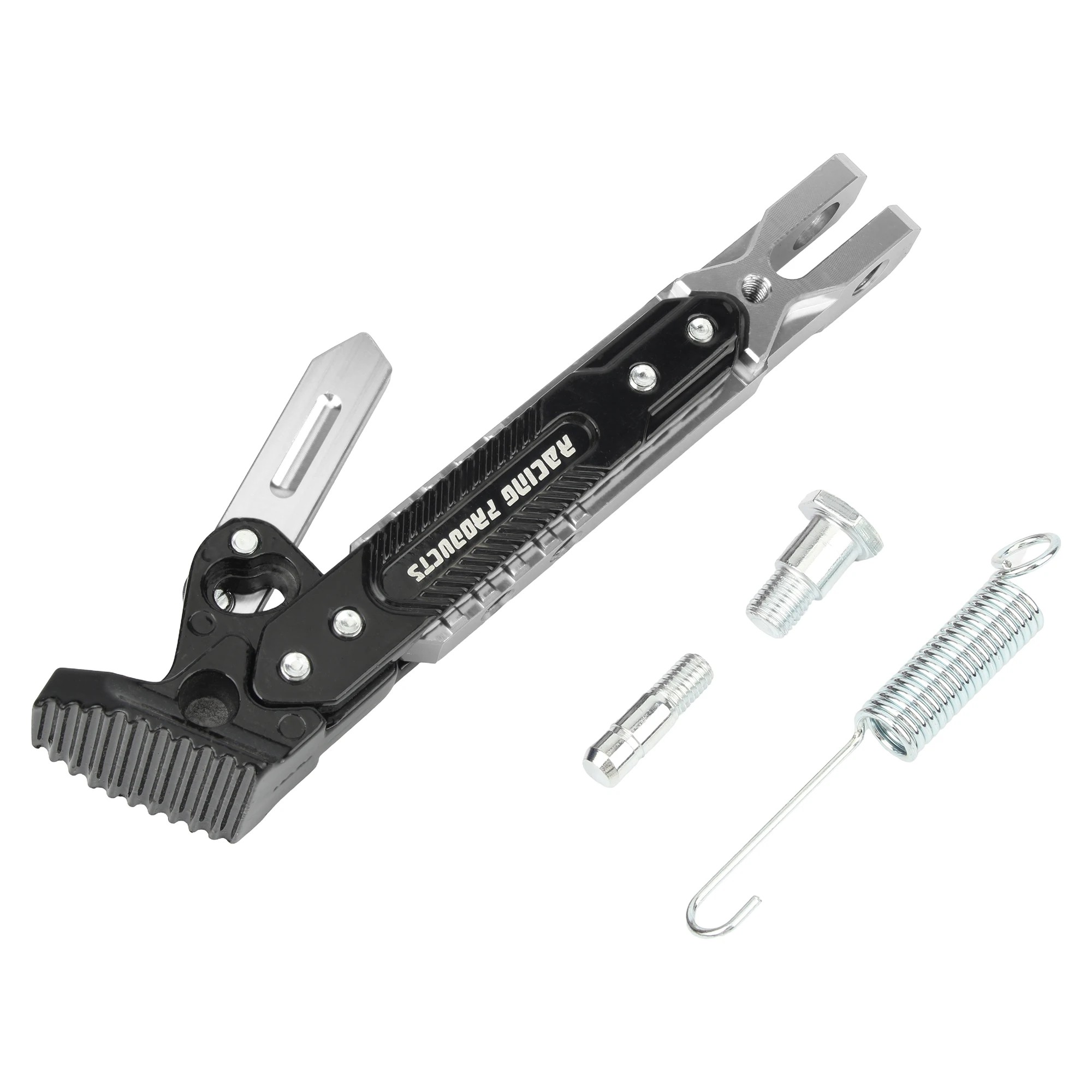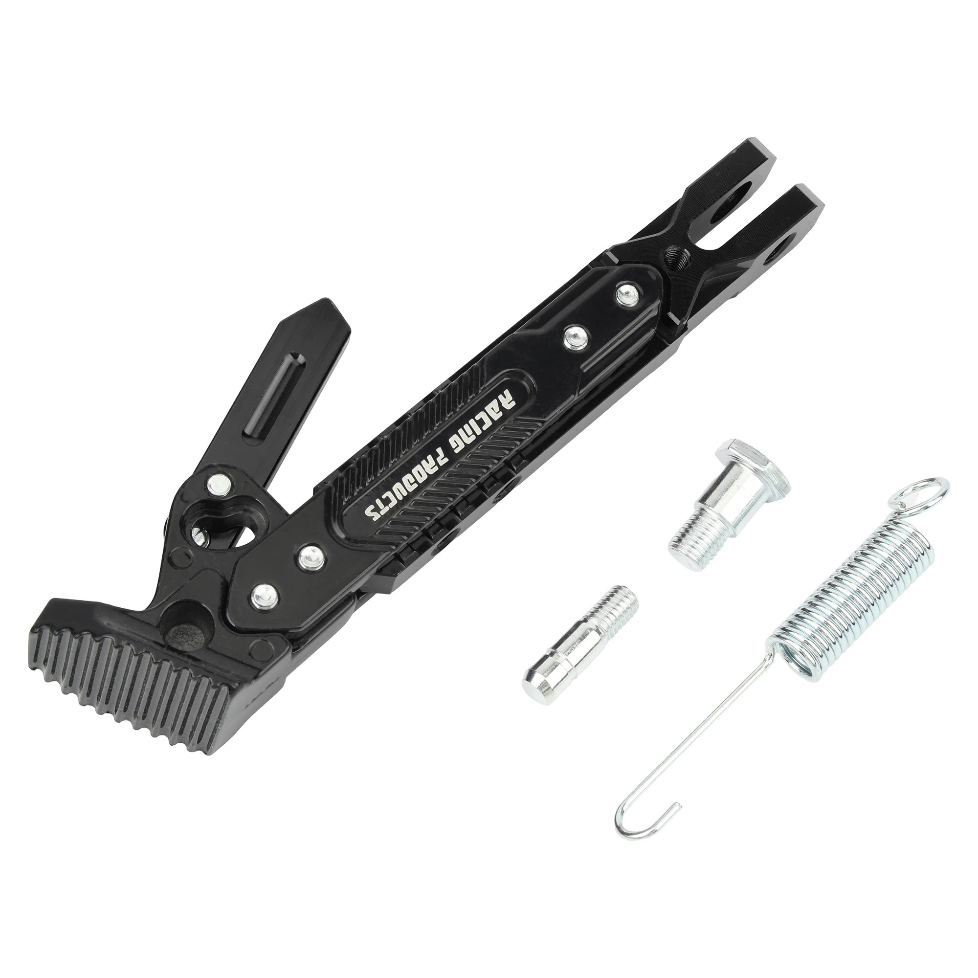 Odolný nastaviteľný bočný stojan na motocykel s farebným prevedením, pružinou a montážnymi skrutkami. Univerzálne použitie pre rôzne značky. Celý popis