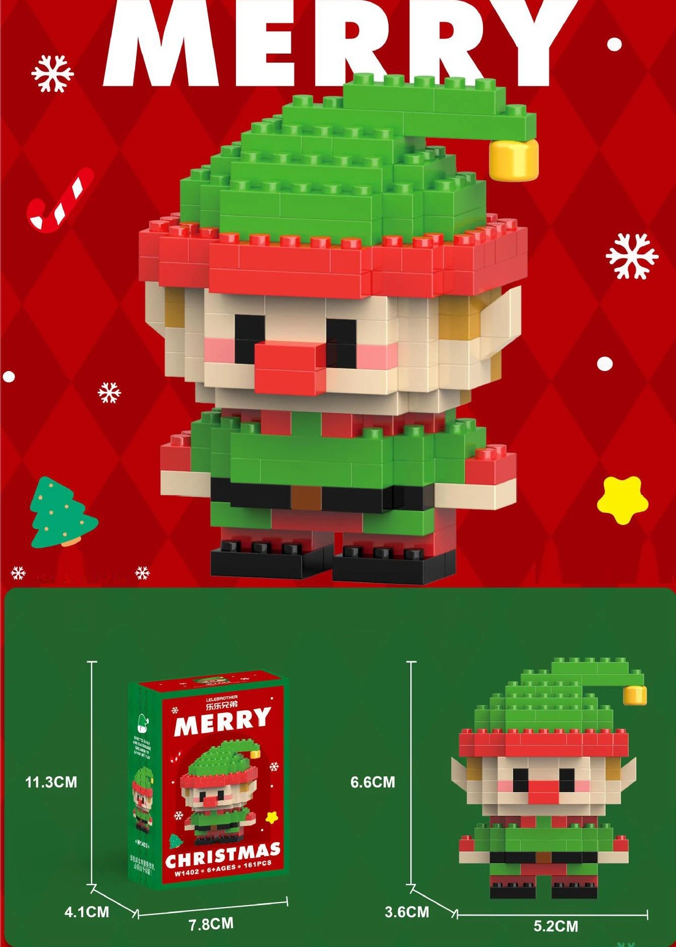Vianočná stavebnica elfa z mikro kociek poteší všetkých milovníkov sviatočnej atmosféry aj tvorivého skladania. Model obsahuje 161 plastových kociek, z ktorých vznikne veselý vianočný elf v zelenom oblečení, s červenou čiapkou a špicatými ušami. Po dokončení meria postavička 5,2 x 3,6 x 6,6 cm, zatiaľ čo krabička má rozmery približne 7,8 x 4,1 x 11,3 cm.