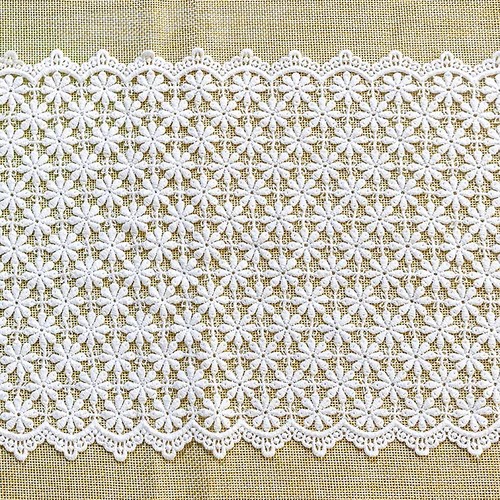 Materiál je vyrobený zo 100% bavlny, ktorá je príjemná na dotyk, dobre priedušná a zároveň dostatočne pevná na rôzne šijacie projekty. Vyšívaný kvetinový okraj dodáva látke dekoratívny charakter a umožňuje jej využitie pri výrobe ubrusov, dekoratívnych behúňov, ozdobných lemov alebo rôznych textilných dekorácií.