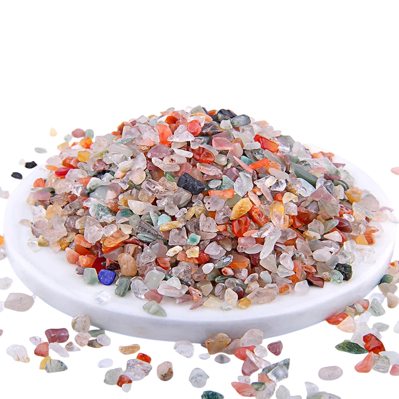 Zmes kremenných kameňov vo forme jemnej drte predstavuje prírodný materiál, ktorý vyniká pestrou farebnosťou a variabilitou. Vďaka veľkosti 3–5 mm sú kamienky vhodné na detailnú prácu a presné rozmiestnenie v rôznych dekoráciách aj kreatívnych projektoch. Farebná kombinácia zahŕňa široké spektrum odtieňov, medzi ktorými možno rozpoznať svetlé, červené, oranžové, zelené aj tmavšie tóny. Balenie o hmotnosti 100 g poskytuje dostatočné množstvo pre väčšie projekty aj častejšie použitie. Nepravidelné tvary jednotlivých kamienkov podčiarkujú ich prirodzený vzhľad.